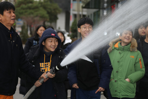 영등포소방서는 11일 오전 영등포소방서 강당 및 차고에서 윤중중학교 1학년 학생 및 지도교사 20여명을 대상으로 진로체험 프로그램 ‘미래소방관 직업체험교실’을 운영했다. 사진은 학생들이 소방호스를 이용해 방수체험을 하고 있는 모습. (사진제공=영등포소방서)