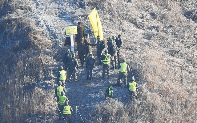남북 군사당국이 ‘9.19 군사분야 합의서’ 이행 차원에서 시범 철수한 비무장지대 내 GP(감시초소)에 대해 12일 오전 상호검증에 나선 가운데 강원도 철원 중부전선에서 우리측 현장검증반이 북측검증반과 만나 인사하고 있다.