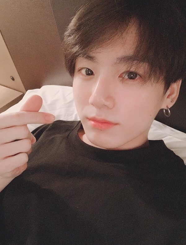 사진 속 정국은 침대에 누워 손으로 작은 하트를 그리며 카메라를 응시하고 있다. 취침 전 민낯임에도 불구하고 뽀송뽀송한 피부가 눈길을 끈다.