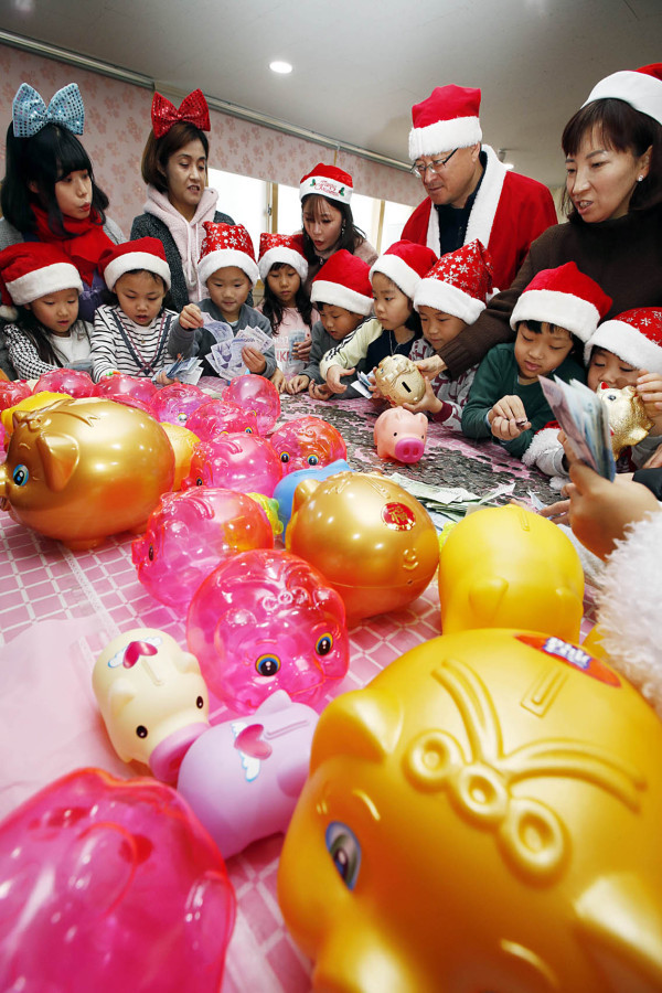 12일 오후 광주 북구 중흥3동 행정복지센터에서 복지센터 직원들이 어린이집 원생들과 돼지 모양의 '사랑의 동전모금함'을 개봉하고 있다. 광주 북구는 알뜰장터 판매 수익금인 이 돈을 지역 경로당에 전달할 계획이다.