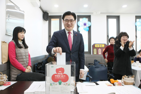 서울 강동구 길동직능단체협의회가 최근 ‘2019년 희망온돌 따뜻한 겨울나기’ 성금모금을 위해 다양한 문화공연 등이 펼쳐진 ‘사랑 愛 향기 일일찻집’을 운영했다. 사진은 행사에 참가한 이정훈 구청장이 성금을 넣고 있는 모습. (사진제공=강동구청)