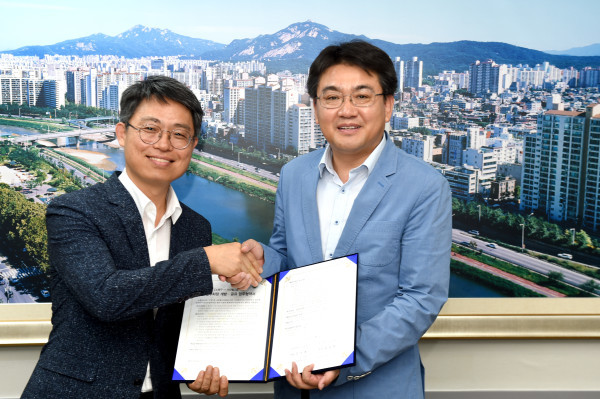 서울 노원구는 최근 서라벌고등학교와 함께 학교주차장 개방 협약을 체결했다. 협약에 따라 서라벌고등학교는 오는 2021년 8월7일까지 주차장 20면을 개방하게 된다. 사진은 오승록 구청장(오른쪽)과 김상덕 교장이 기념촬영을 하는 모습. (사진제공=노원구청)