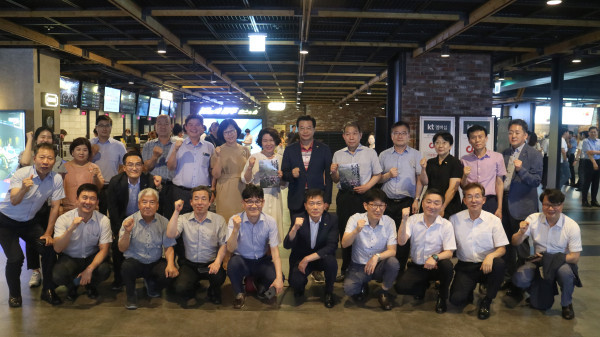 성장현 서울 용산구청장(뒷줄 오른쪽에서 여섯 번째)과 구청 간부 공무원들이 지난 8일 오후 CGV용산아이파크몰에서 1920년 홍범도 장군이 이끈 '대한독립군'의 이야기를 그린 영화 <봉오동 전투>를 관람했다. 사진은 영화 관람 후 기념촬영 모습. (사진제공=용산구청)