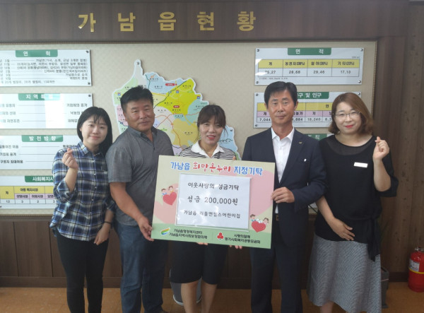 경기 여주시 가남읍 리틀엔젤스어린이집 24명의 원아와 교사들은 최근 바자회를 통해 마련한 수익금 20만원을 어려운 이웃을 위해 써달라며 읍행정복지센터에 전달했다. 사진은 어린이집 및 행정복지센터 관계자들이 기념촬영을 하는 모습. (사진제공=여주시청)