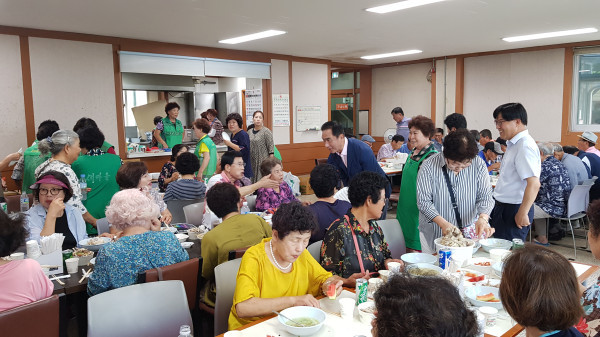 경기 평택시 진위면 새마을부녀회는 최근 진위면사무소 구내식당에서 복달임 행사를 개최해 200여명의 노인들에게 점심식사를 대접했다. 이날 부녀회는 삼계탕, 과일, 떡 등의 음식을 마련했다. 사진은 정장선 시장이 노인들과 인사를 나누는 모습. (사진제공=평택시청)